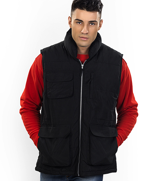 Prsluk, štepan, visoka kragna, unutrašnji lastiš oko ramena za dodatnu zaštitu od vetra, šest prednjih džepova, jedan unutrašnji džep, lice prsluka od brušenog mikrofi bera, unutrašnjost poliesterska postava sive boje, elastični učkuri sa steznim regulatorom u dnu, zadnja strana prsluka duža od prednje, skriveni unutrašnji rajsferšlus na leđima za lakši pristup prilikom štampanja